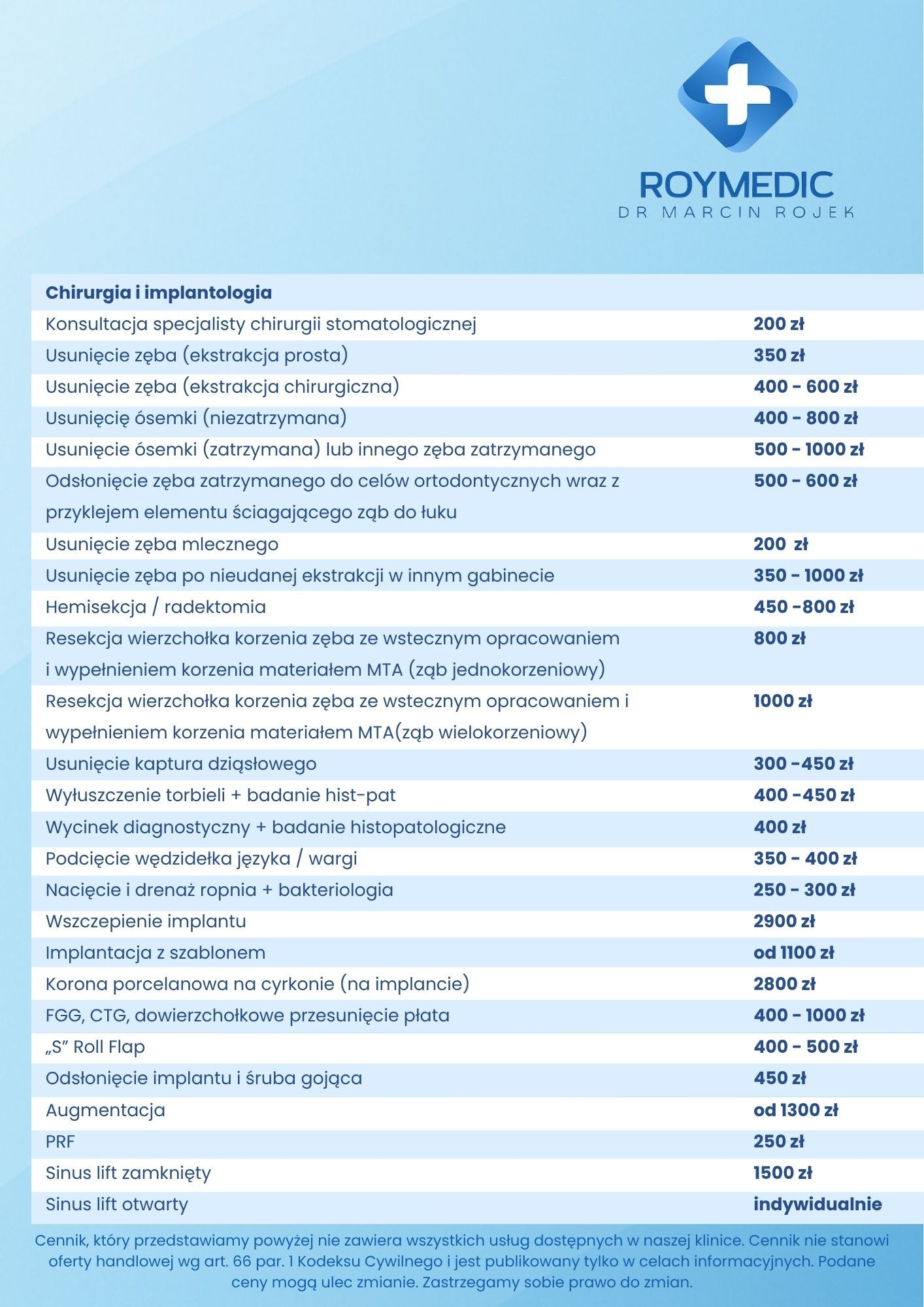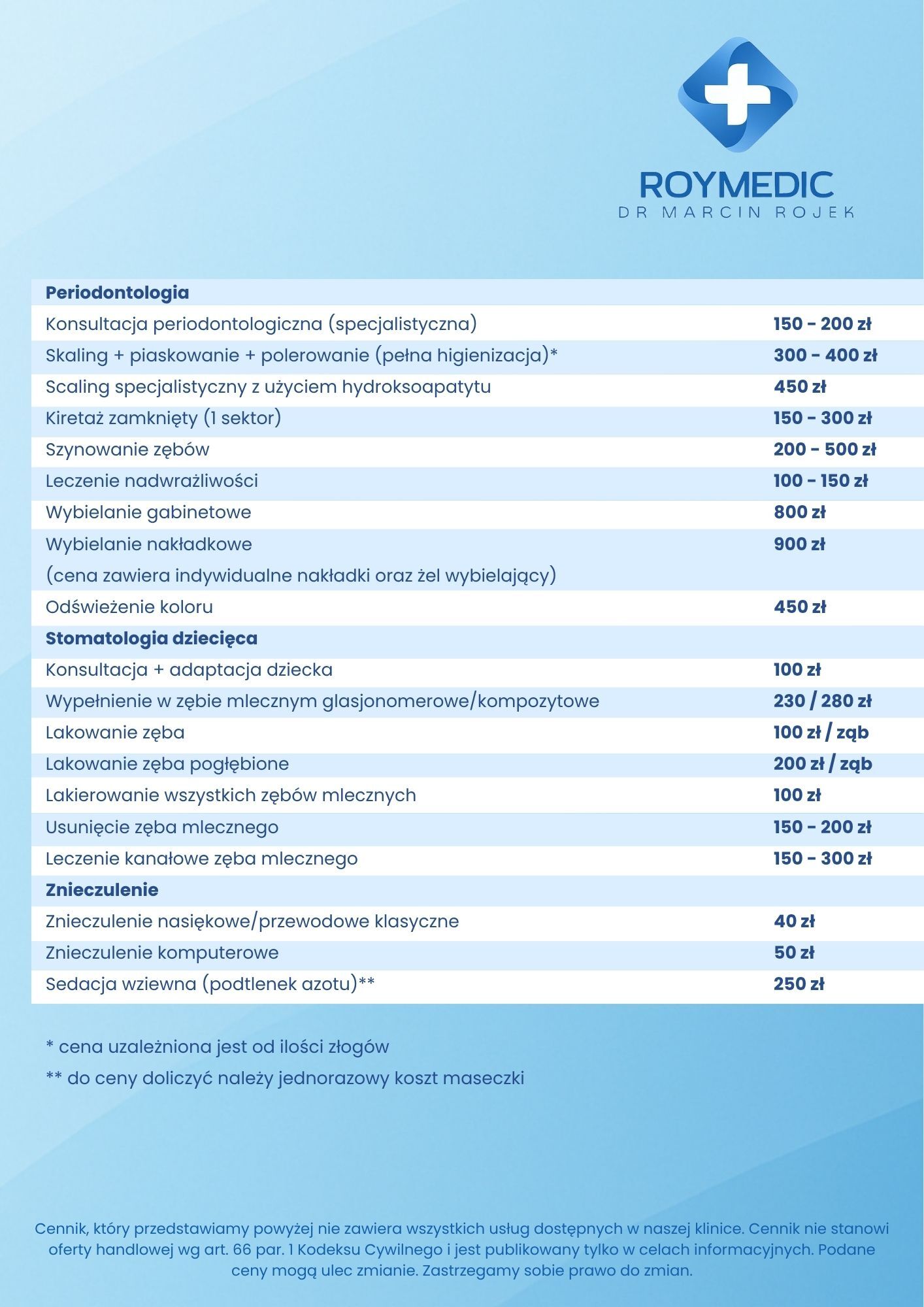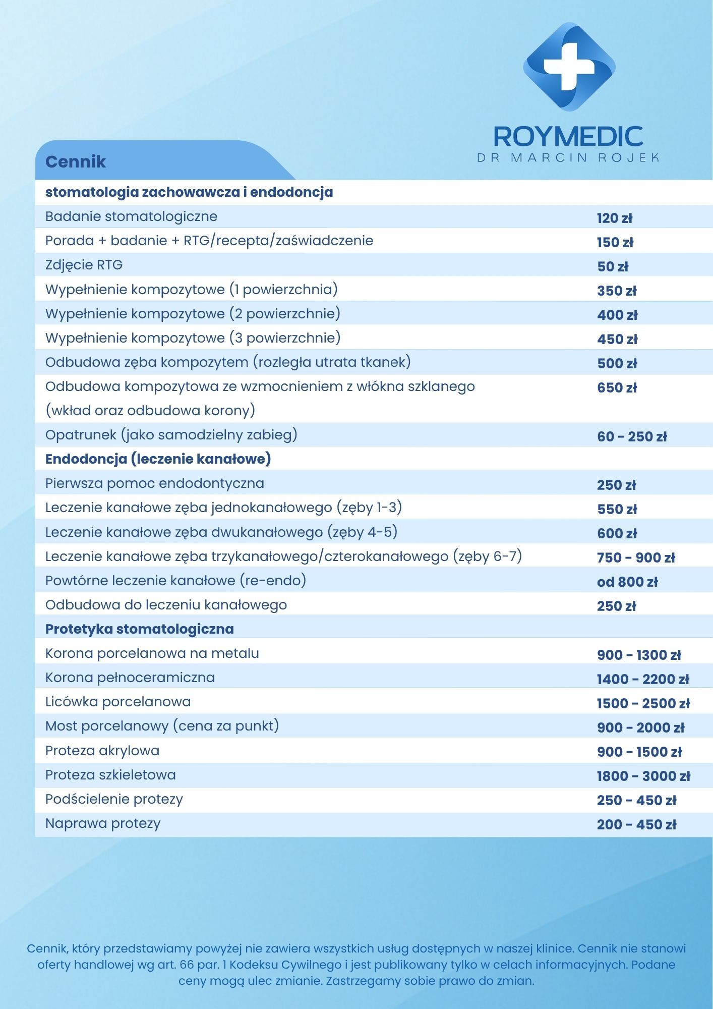 Cennik usług stomatologicznych